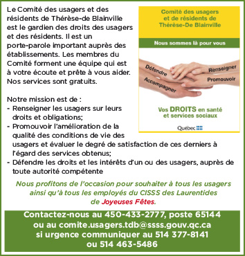 Catégories Non classé COMITÉ DES USAGERS ET DE RÉSIDENTS DE THÉRÈSE-DE BLAINVILLE Auteur de l’article Par pub_content_publisher Date de l’article 23 novembre 2022
