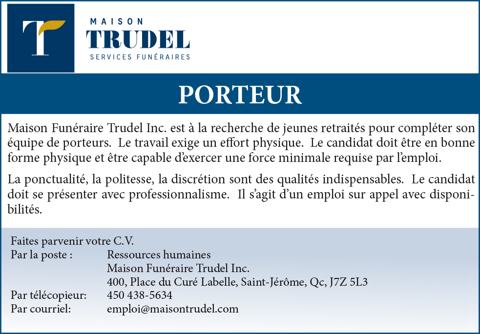 Catégories Non classé CL10601 MAISON FUNÉRAIRE TRUDEL Auteur de l’article Par pub_content_publisher Date de l’article 6 juin 2022 Publicité